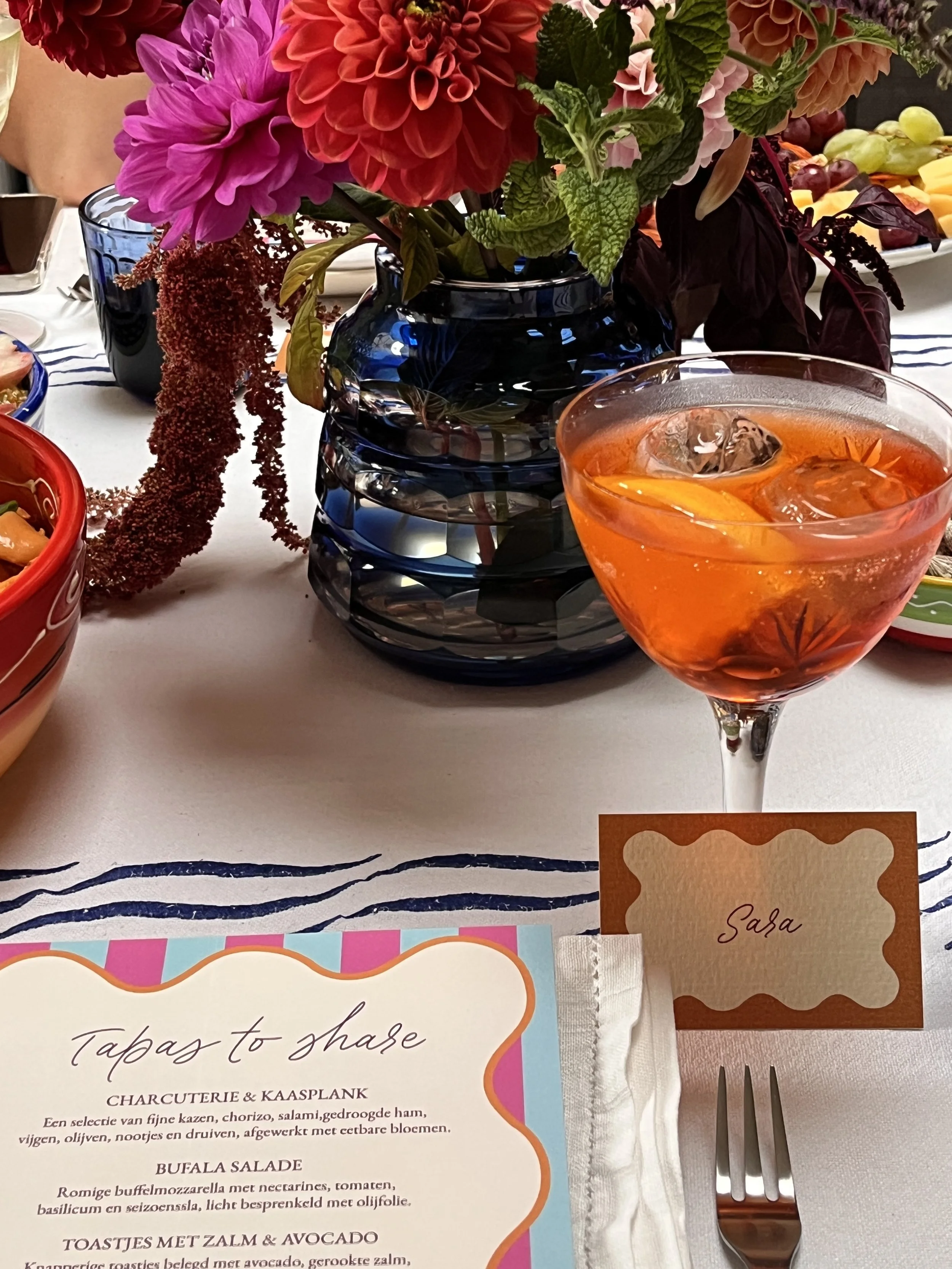 An intimate birthday celebration elevated into a creative brand experience. Guests discovered a cohesive world where menu cards, name tags, food styling, flowers and even the bar menu formed one seamless aesthetic. The event also doubled as a campaign moment, showcasing how personal occasions can become design statements.